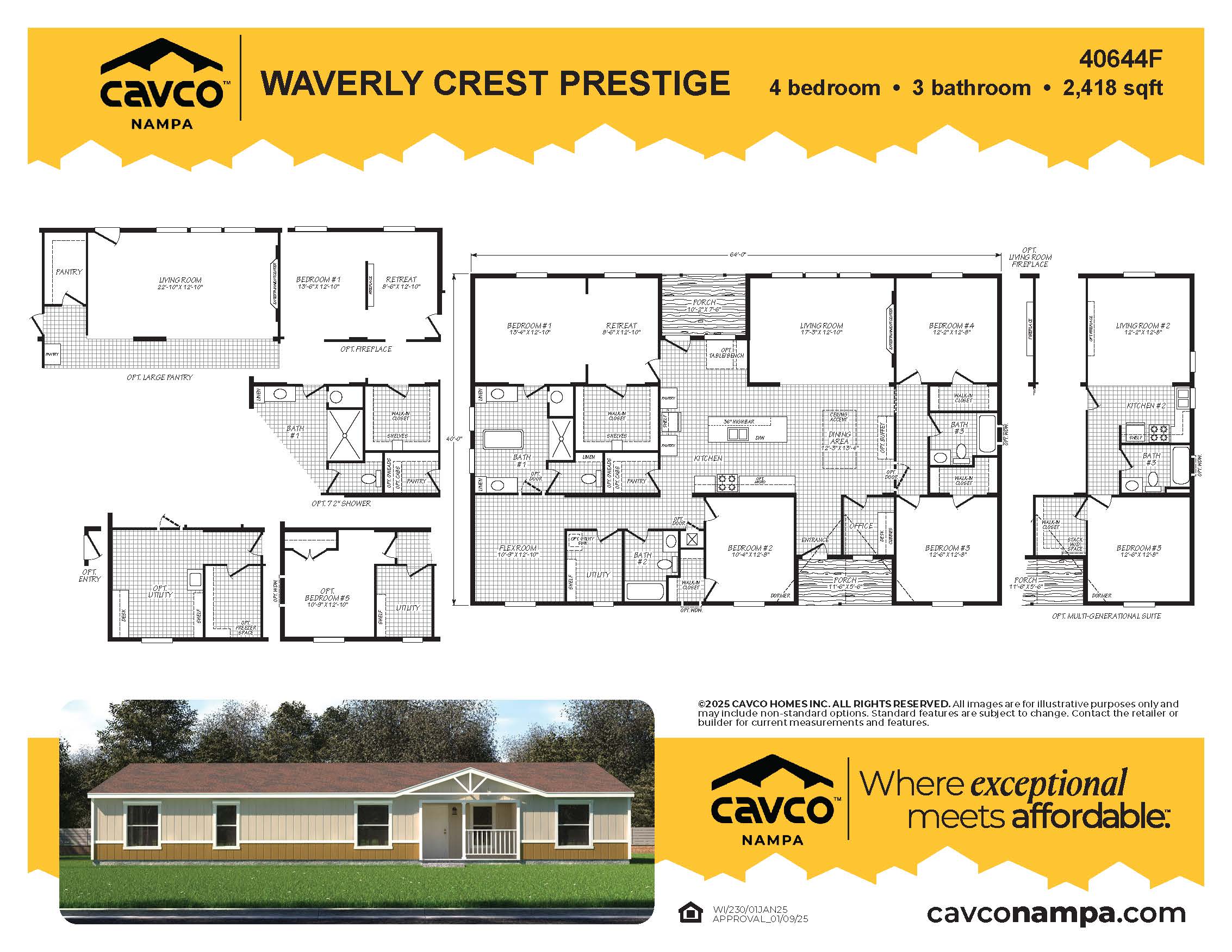 The Blackfoot (Model 40644F) by Cavco is a truly expansive home from the Waverly Crest Prestige Series, offering approximately 2,418 square feet of thoughtfully designed living space. With four bedrooms, three bathrooms, and an impressive triple wide layout, this floorplan provides exceptional comfort and flexibility for modern households. Unique options like a flex room, private retreat, and optional multi-generational suite with separate living space make this one of the most versatile homes in the entire lineup.