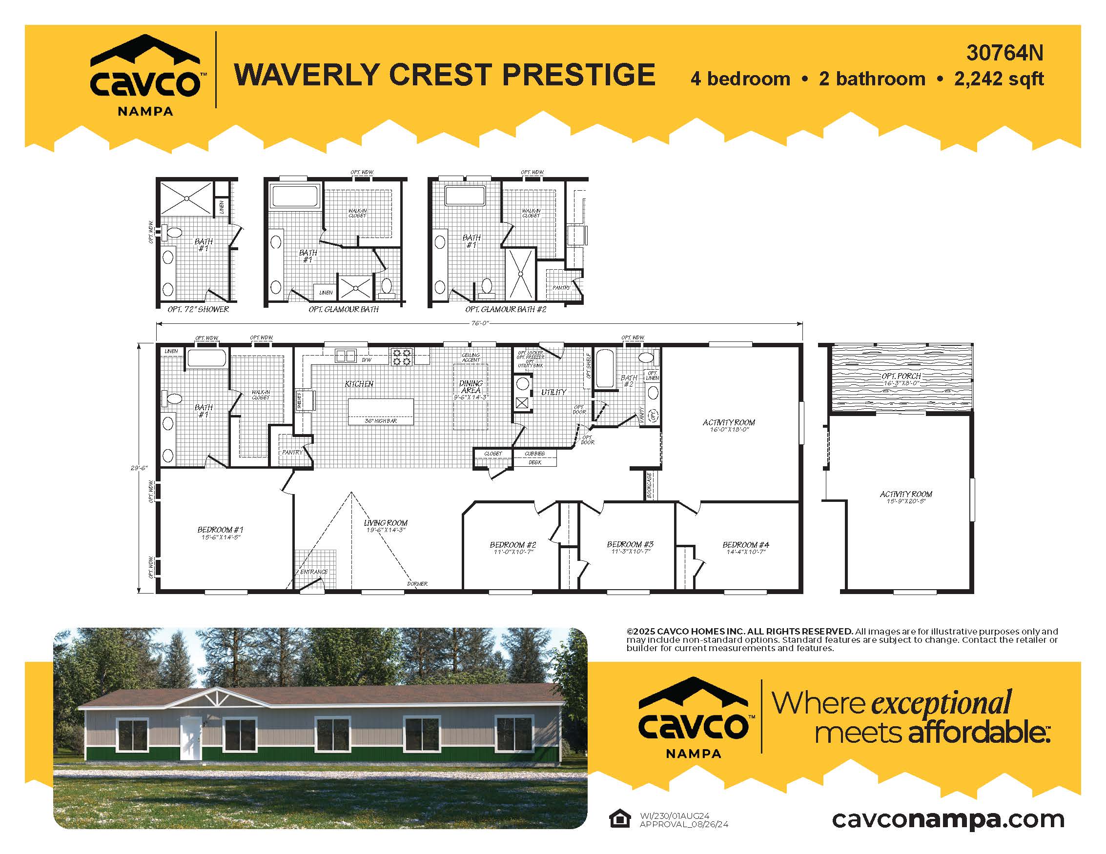 The Gold Fork (Model 30764N) is a spacious and versatile home from Cavco’s Waverly Crest Prestige Series, offering approximately 2,242 square feet of thoughtfully designed living space. With four bedrooms, two bathrooms, and an expansive activity room, this floorplan is designed for families who want room to live, gather, and grow. The wide open living areas, large kitchen, and flexible bonus space make the Gold Fork one of the most adaptable homes in the lineup.