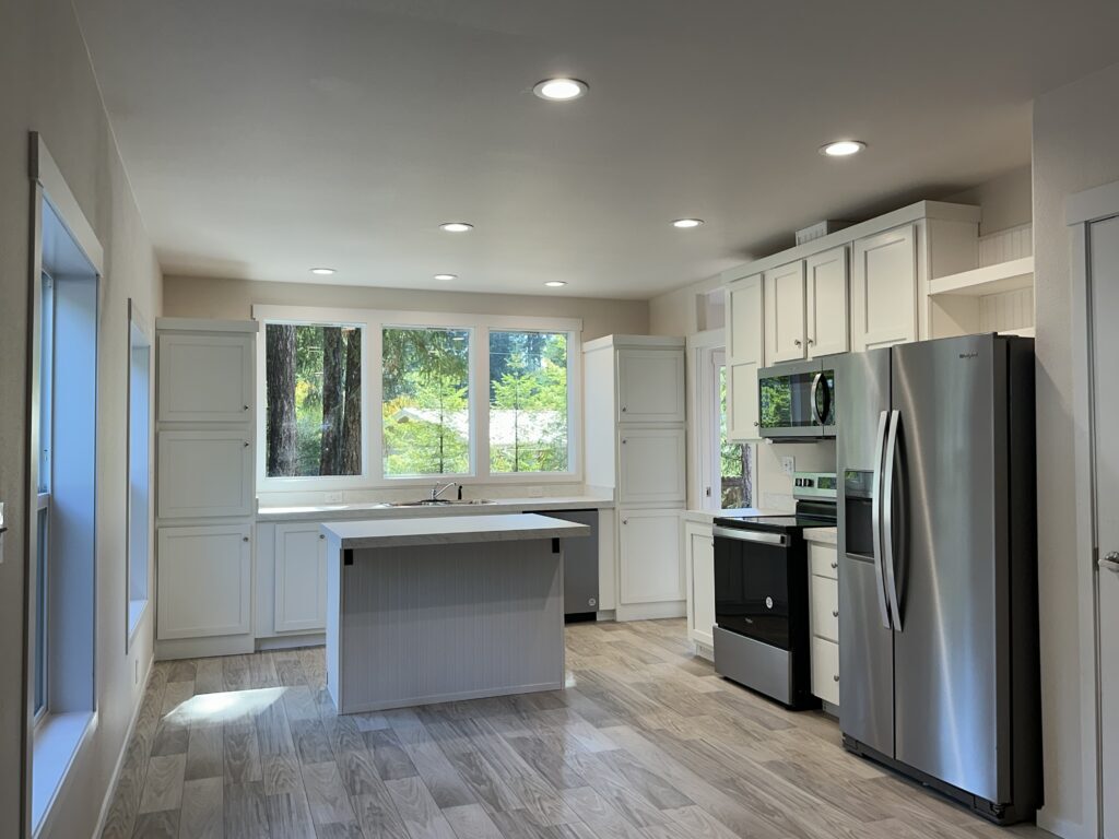 The kitchen is outfitted with stainless steel appliances, sleek countertops, and ample storage, making it as practical as it is beautiful. Large windows allow natural light to pour in, keeping the space bright and airy, even during the cloudy PNW days we all know so well.
